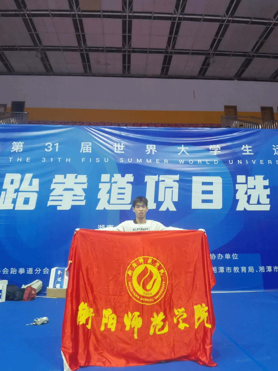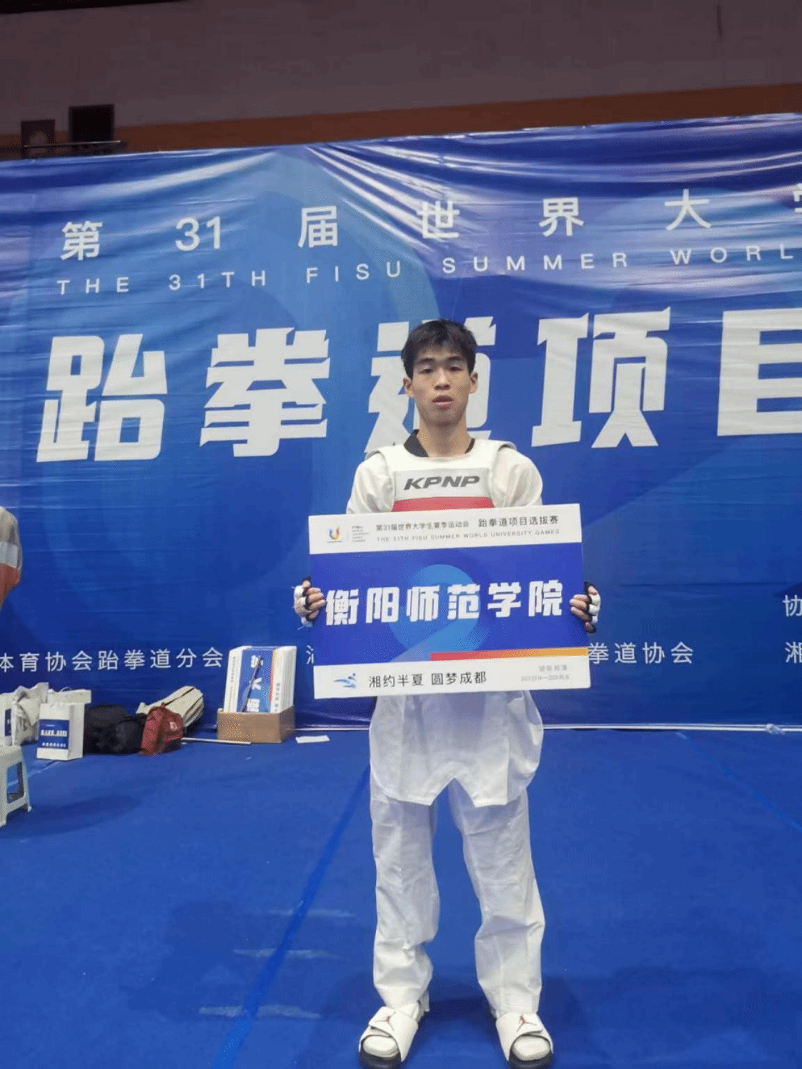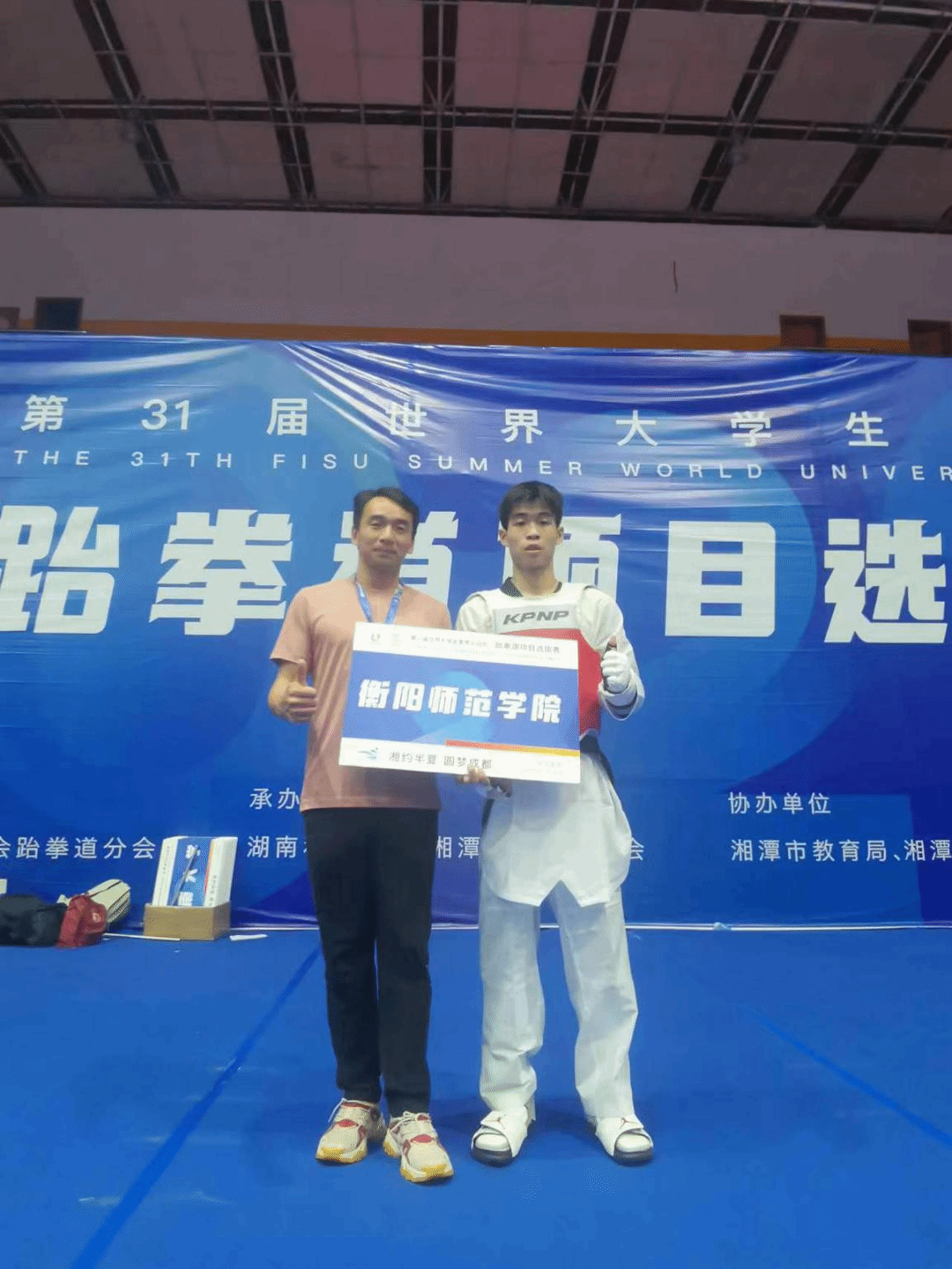 5月14日-18日,由中国老员工体育协会主办(隶属教育部)、中国老员工体育协会跆拳道分会执行的第31届世界老员工夏季运动会跆拳道项目选拔赛,在湖南科技大学举行。2020级运动训练专业员工刘磊经过多轮苦战,终获男子跆拳道竞技-54公斤级比赛冠军,并获得7月成都举办的世界老员工夏季运动会参赛资格。