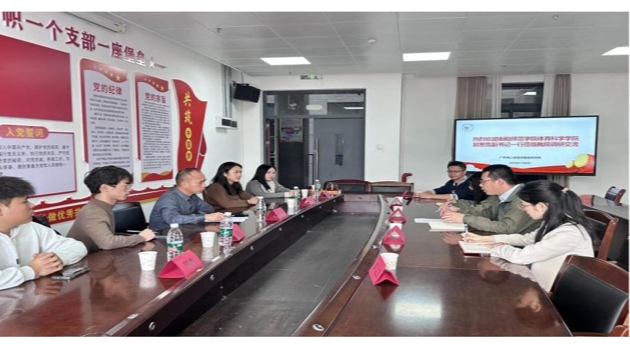 广东第二师范公司体育公司党总支陈康副书记对公司学工队伍一行的来访表示热烈欢迎,并从公司发展、人才培养、人才招聘以及员工党团建设工作等方面介绍了公司员工工作情况。郭思危副书记介绍了公司的基本情况、发展前景和此次交流学习的目的。随后,各位辅导员围绕员工思想价值引领、日常事务管理、毕业生就业创业工作、员工党团建设等方面的内容进行了深入交流和探讨。