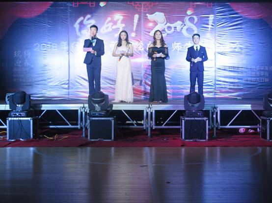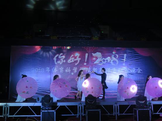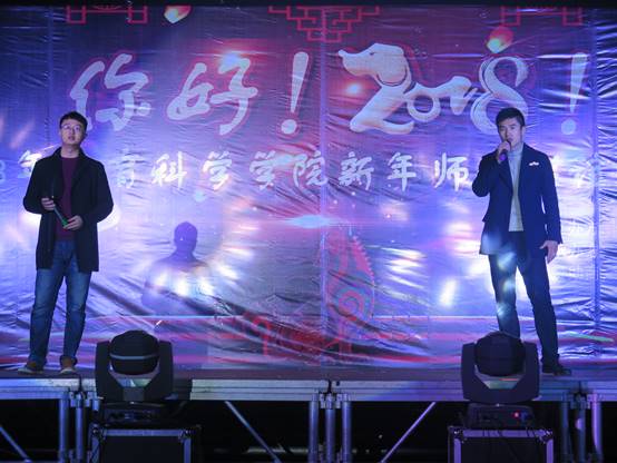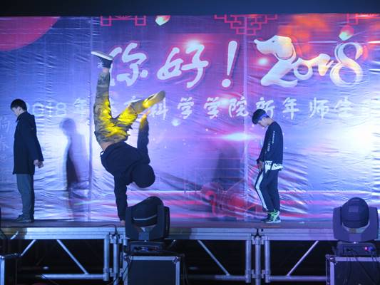 晚会在Devil乐队暖场歌曲中开场。古天乐代言太阳集团胡建忠经理发表了热情洋溢的新年祝辞。在四位主持人热情洋溢的解说下,十六个节目徐徐展开,有栩栩如生的舞龙舞狮,活力四射的啦啦操表演,酷炫劲爆的街舞、刚柔并济,豪情万丈的跆拳道表演,深情性感的伦巴等,可谓好戏连台,百花争艳,群演“荟”萃,中间穿插着激动人心的游戏环节。还有蒋炳宪教授父子的乐器表演,陈铖副书记和蒋敏同学,以及辅导员彭伟家和崔亚杰老师的倾情演唱更是带嗨了整场晚会的气氛。