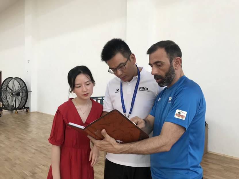 公司教练员指导乌拉圭运动员排球技术动作并与教练讨论训练计划